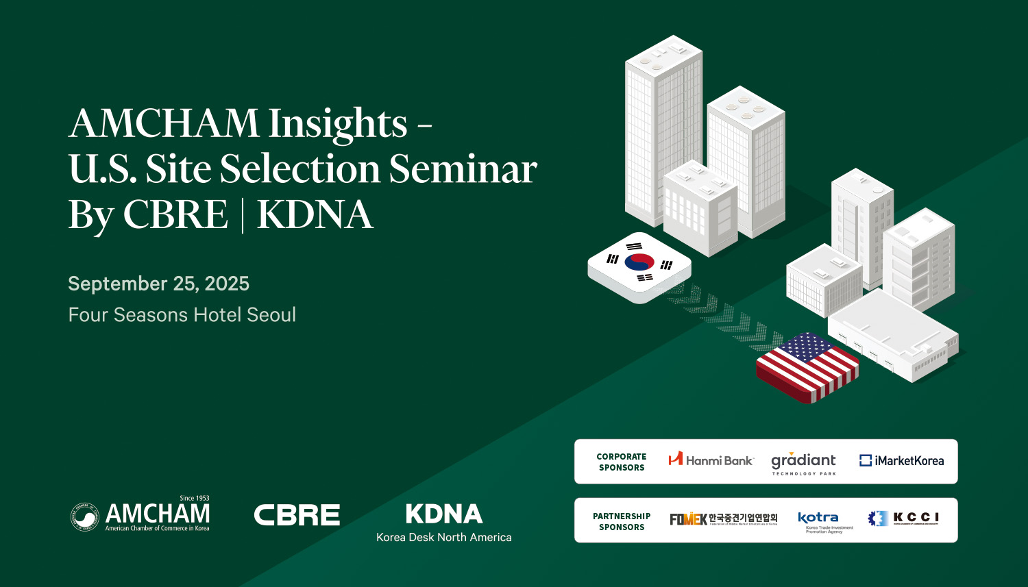 As Korean companies accelerate their expansion into the United States, the importance of strategic site selection and real estate planning has never been greater. To support this momentum, AMCHAM Korea and CBRE Group’s Korea Desk North America - KDNA are pleased to co-host a special seminar focused on navigating the U.S. commercial real estate landscape, with a particular emphasis on the needs of corporate occupiers. This exclusive, in-person event will provide actionable insights into the latest trends across key U.S. commercial sectors—including site selection, location incentives, labor analytics, project/construction management, and supply chain—while offering a deep dive into the site selection process and regional incentive programs. |