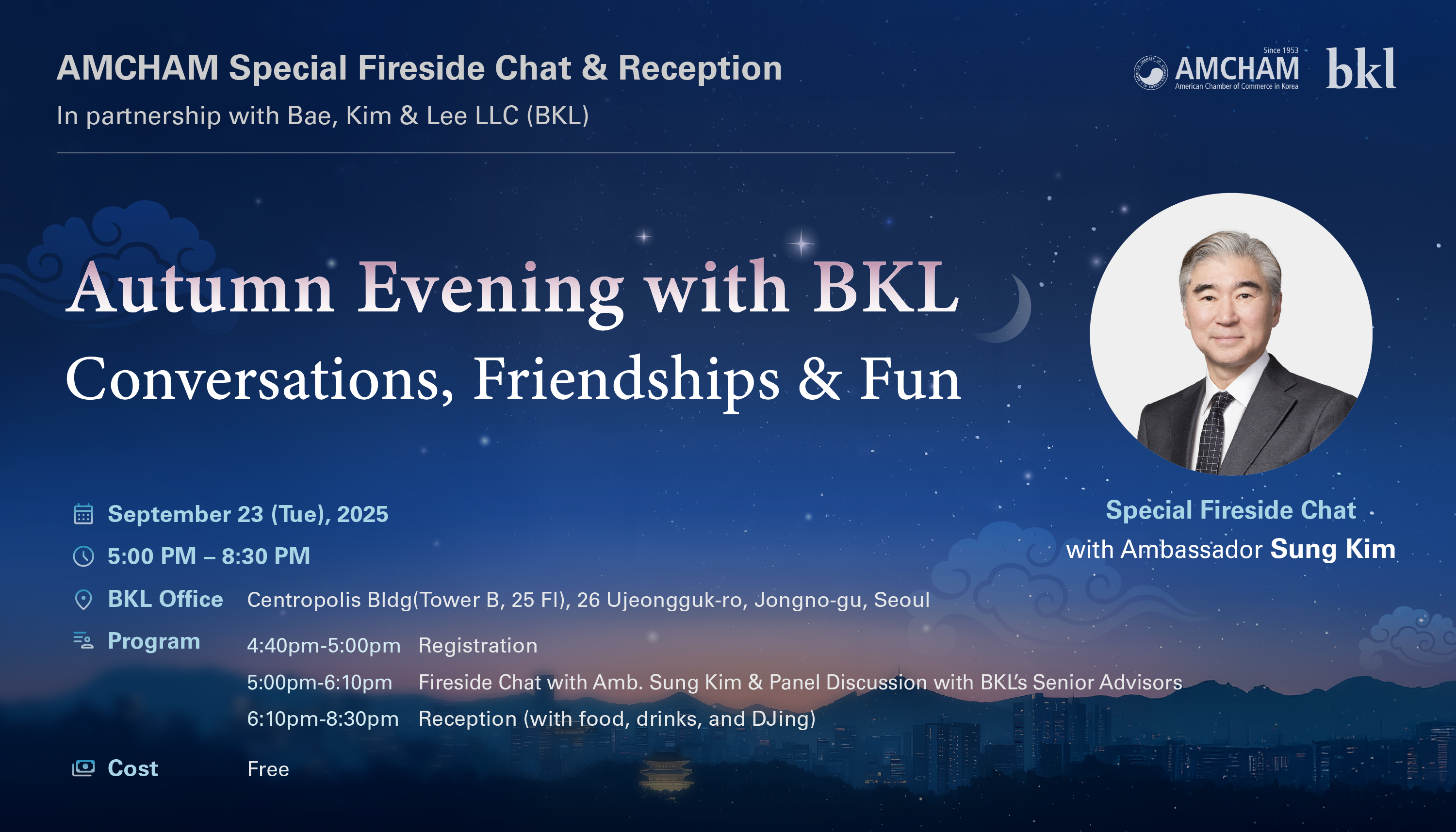 AMCHAM will host a Special Fireside Chat & Reception in partnership with Bae, Kim & Lee LLC (BKL), Korea’s leading law firm. The program will open with a high-level Fireside Chat featuring key opinion leaders in diplomacy, international trade, finance, and global affairs. Speakers or Panelists will share their perspectives on U.S. trade and foreign policy, as well as the new Korean administration’s approach to navigating today’s global uncertainties.