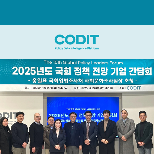한국경제 - AI 법·규제·정책 플랫폼 코딧(CODIT, 대표 정지은) 부설 ‘글로벌정책실증연구소’(이하 ‘연구소’)는 지난 23일 <2025년도 국회 정책 전망 기업 간담회> 주제로 제10회 코딧 Global Policy Leaders Forum을 성황리에 개최했다고 밝혔다. 국회 입법조사처(이하 ‘입조처’) 홍일표 사회문화조사실장이 주제 강연을 한 이날 간담회에는 AWS코리아, 한국MSD, 한국베링거인겔하임, ㈜파라다이스 등 국내외 주요 기업 15여 개사가 참석했다.