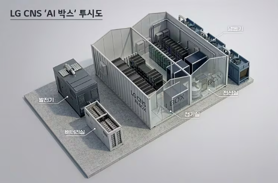 LG CNS는 데이터센터 설계·구축·운영(DBO) 역량을 활용해 AI 플랫폼, 전력·냉각 인프라, IT 장비를 AI 박스에 통합 설계했다. LG전자의 냉각수 분배 장치(CDU), 항온항습기, 냉동기와 LG에너지솔루션의