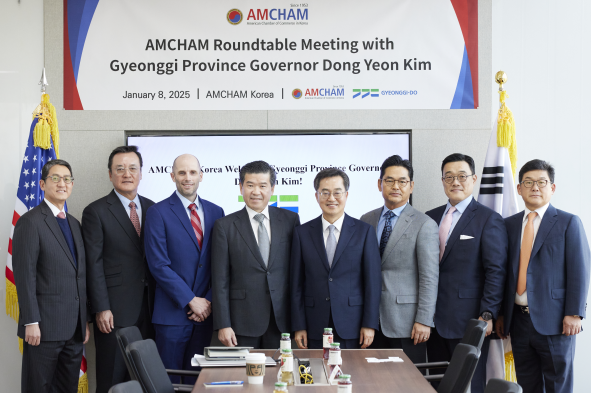 January 8, 2025 - The American Chamber of Commerce in Korea (AMCHAM; Chairman and CEO James Kim) hosted a special roundtable meeting today with Gyeonggi Province Governor Kim Dong-yeon at the AMCHAM office in Yeouido.